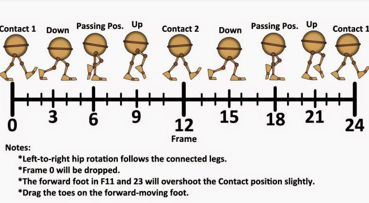 There are three key postures in the walking cycle.Key poses: In a walk these would be your contact poses.Breakdowns: The passing position between your key poses.Extremes: These are the highest and lowest points of the walk.