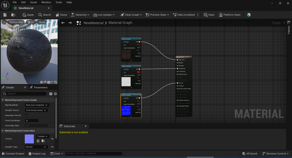 Learned the material system in ue, knew that each map corresponding to the material node has natural color roughness normal, learned how to apply external map assets.