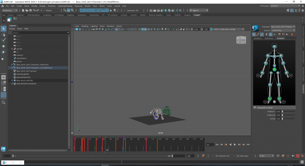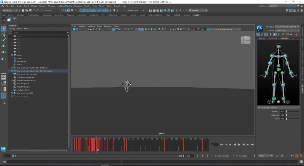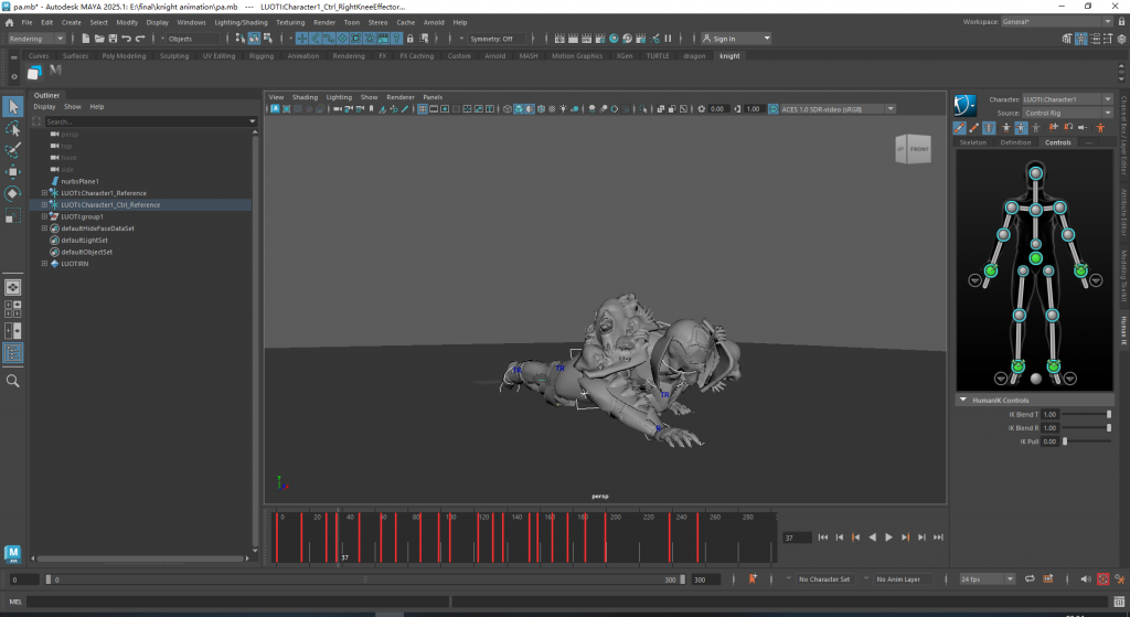 Based on my own version of the story, I looked for references and then animated the knights, the first walking, the second falling from a height, the third running and then jumping up and chopping, and the fourth crawling on the ground.