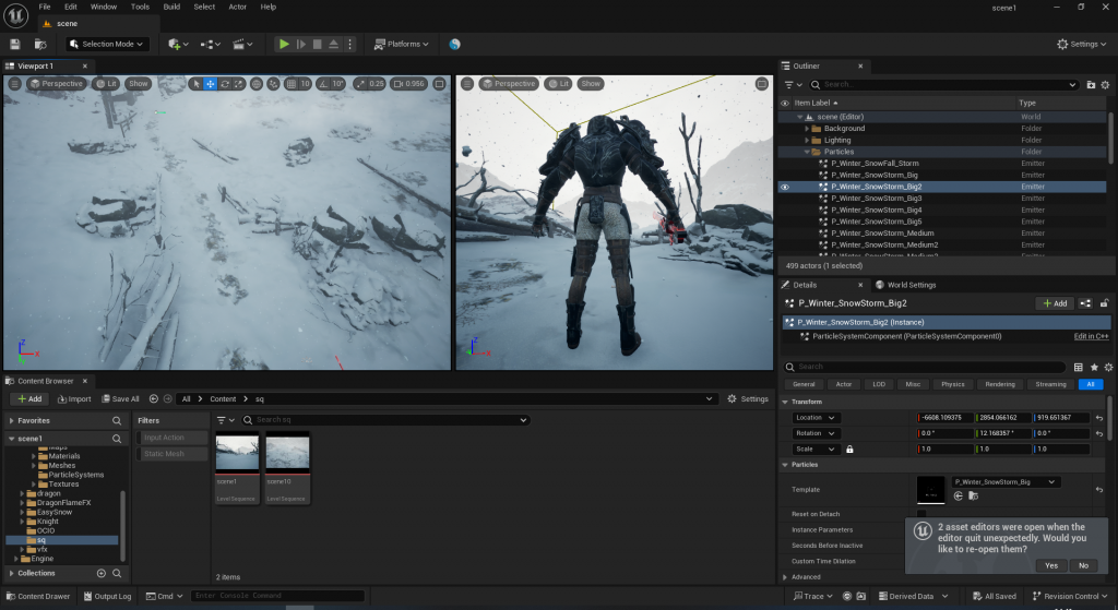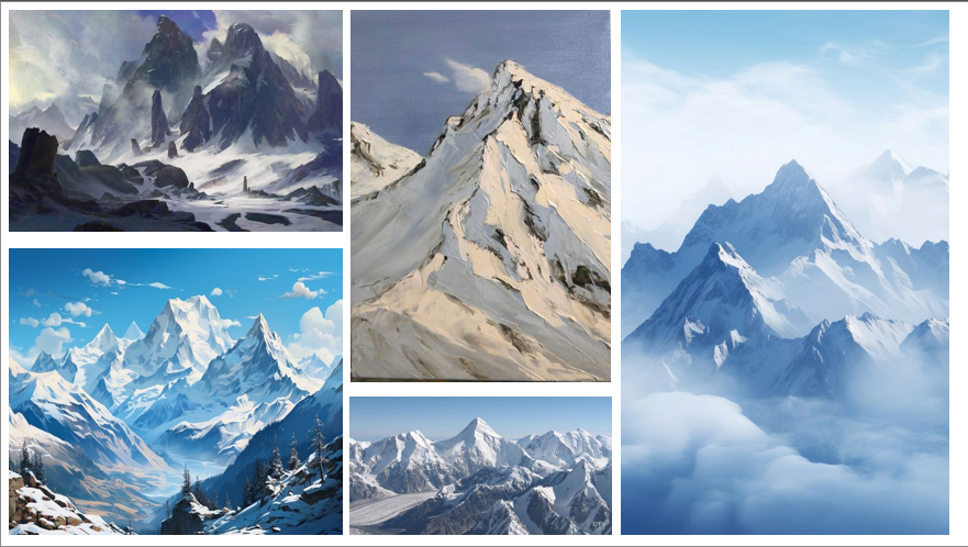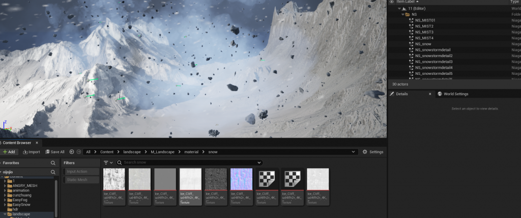 The snowy landscape consists of snowy mountains on several sides and some flat land in the middle of it On the flat land, I put some dead wood and stones to create the feeling of a broken village.