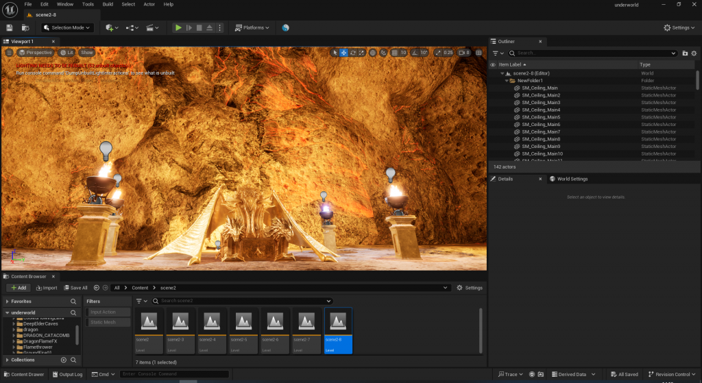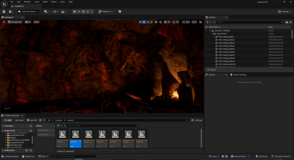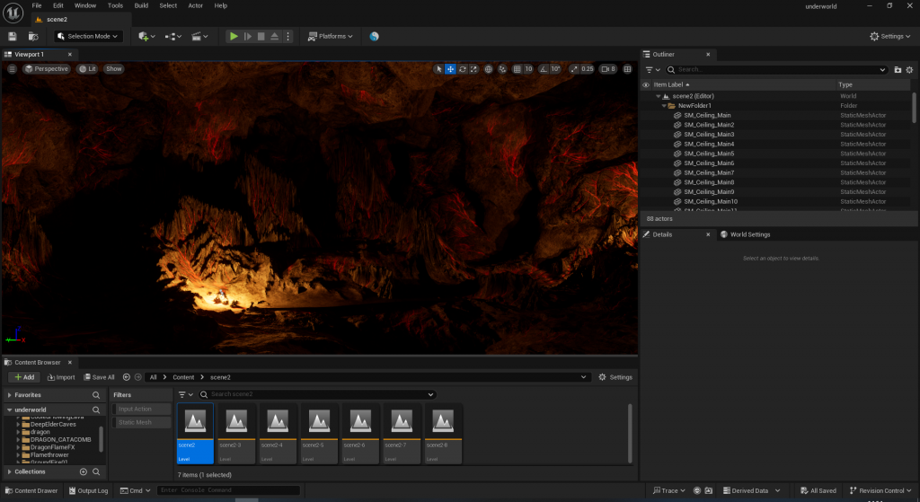 The cave scene is made up of volcanic rocks and some blueprints of flames where the lights are set off by the lights of the flames.