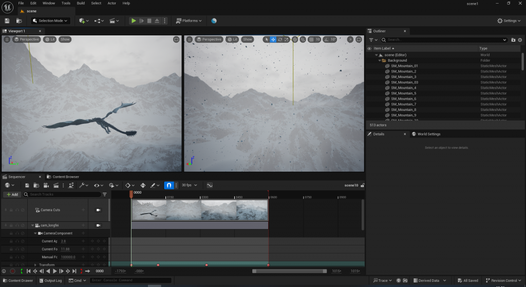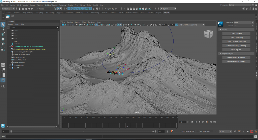 I put the assets I made for the snowy mountains into maya, put in the animation I made earlier for the dragon fly, constrained the path of the dragon fly with the trajectory animation, and then exported the abc cache before putting it into ue5